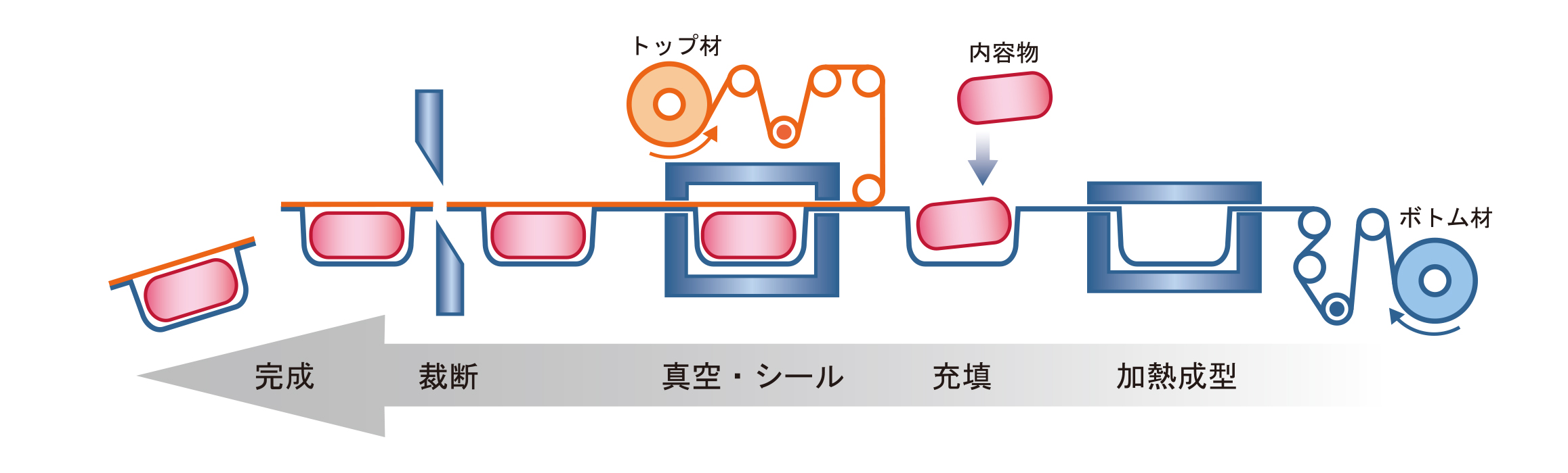 ボトム材を金型に合わせて加熱成型し、容器形状にします。その成型部分に内容物を入れた後、トップ材でふたをするように真空、熱圧着を行う包装形態です。この一連の動作を深絞り包装機で行います。